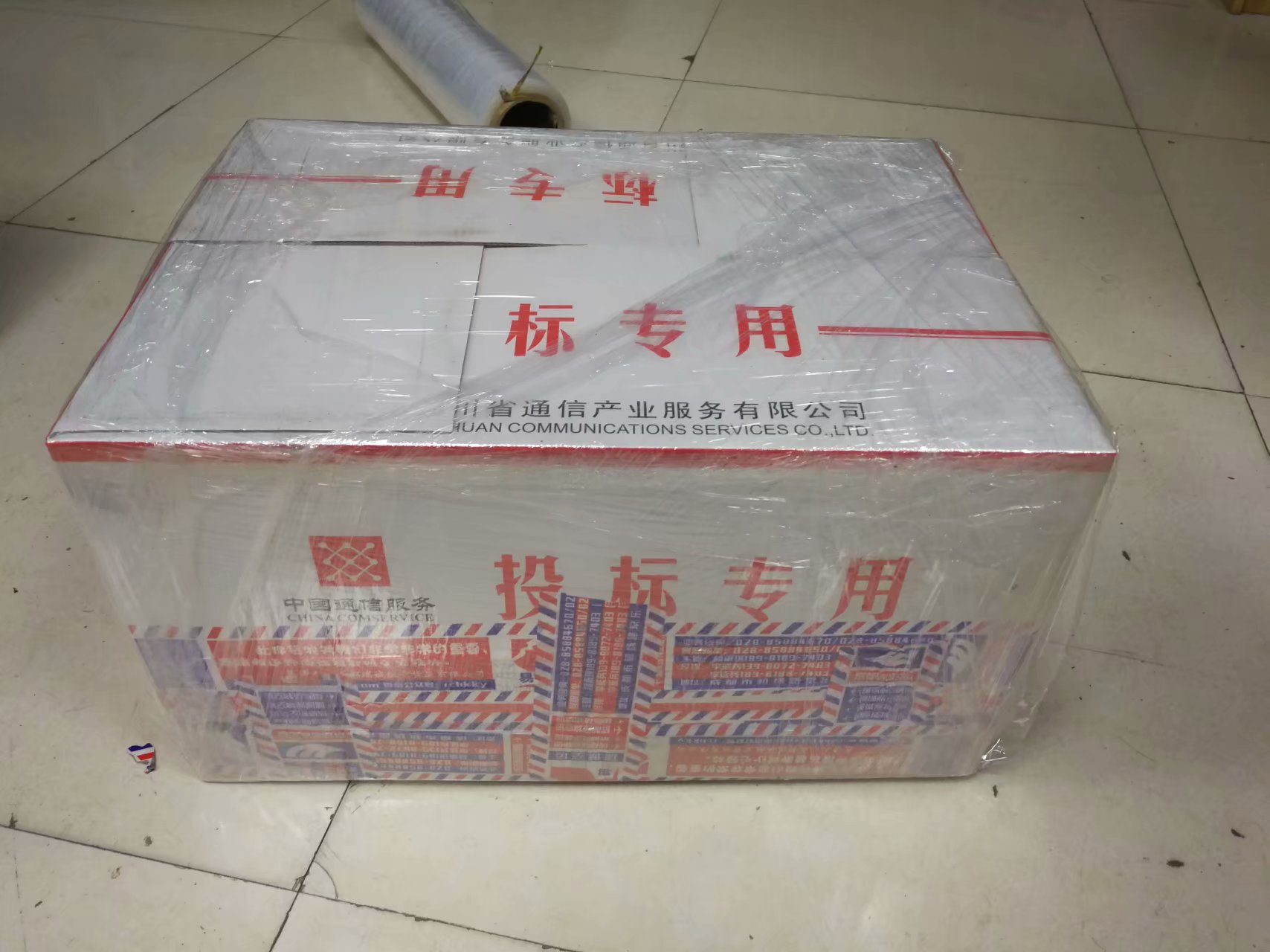 图为成都瑞诚航空货运有限公司的标书空运包装,所有纸质文件均采用专用纸箱加防水膜处理